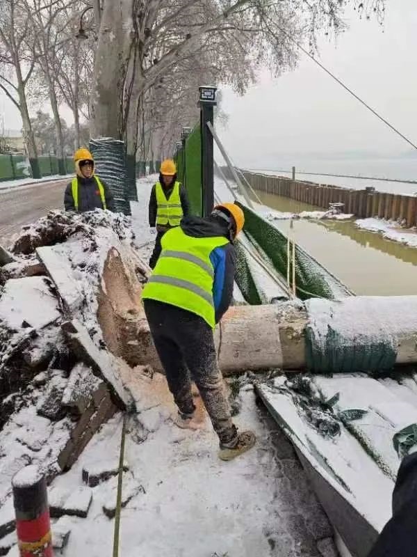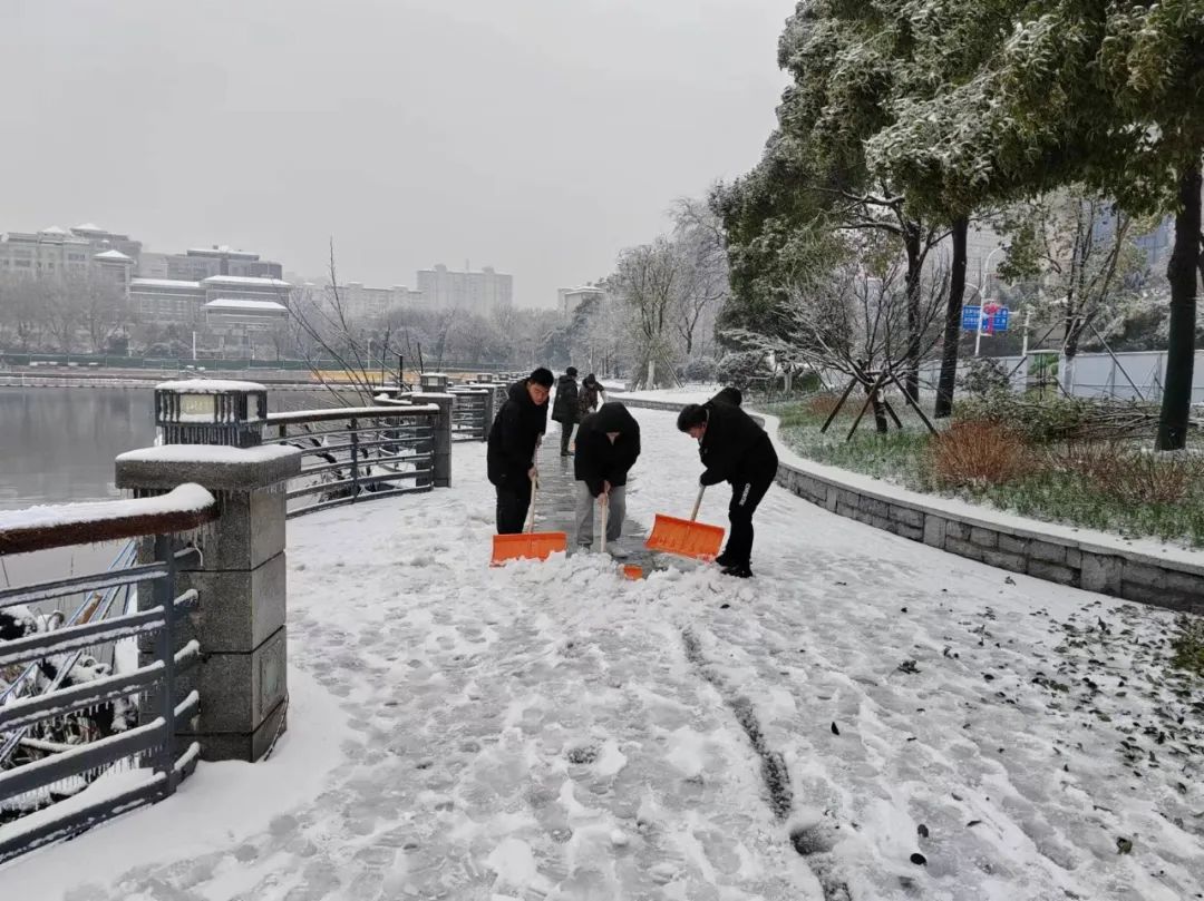 ? ? ? ?2月4日04時(shí)10分,武漢市氣象臺(tái)發(fā)布暴雪黃色預(yù)警信號(hào)。東湖綠道三期項(xiàng)目位于東湖南路,雙向兩車道,毗鄰東湖,道路臨水、彎多、路窄,一旦結(jié)冰行車時(shí)危險(xiǎn)性極高。清晨6點(diǎn)半不到,項(xiàng)目部突擊隊(duì)員們?cè)谖錆h大學(xué)凌波門集合,投入到緊張的鏟雪除冰行動(dòng)。經(jīng)過(guò)近6個(gè)小時(shí)的與雪“共舞”,東湖南路凌波門附近積雪和厚冰被突擊隊(duì)一掃而凈。截至5日下午15時(shí),為放鷹臺(tái)段人行通道420米、東湖南路3公里掃雪除冰,清理倒伏法桐一棵、沿線因雪壓落樹(shù)枝全部清理完畢,道路無(wú)結(jié)冰且通行狀態(tài)良好。