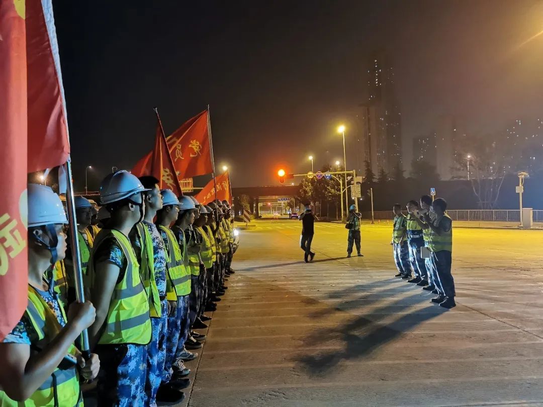 ? ? 7月21日22:00分,隨著第一分隊指揮長來德志一聲令下,分隊配備的2臺指揮車輛、1臺自卸車、1臺平板拖車、1臺推土機和載有尖刀隊員的大巴車準時從南湖水環境提升項目部集結點出發,開向武金堤白沙洲大橋閘口處。為避免道路紅綠燈影響通行時間,指揮部前期已聯系協調交警,保證搶險通道一路暢通。22:20分,全體人員、車輛和機械有序抵達了武金堤險情段的指定地點。此次實戰演練集結登車用時7分鐘,從出發地到搶險地用時20分鐘,均在市應急管理局要求范圍之內,充分檢驗了第一分隊前段時間鍛煉成果。