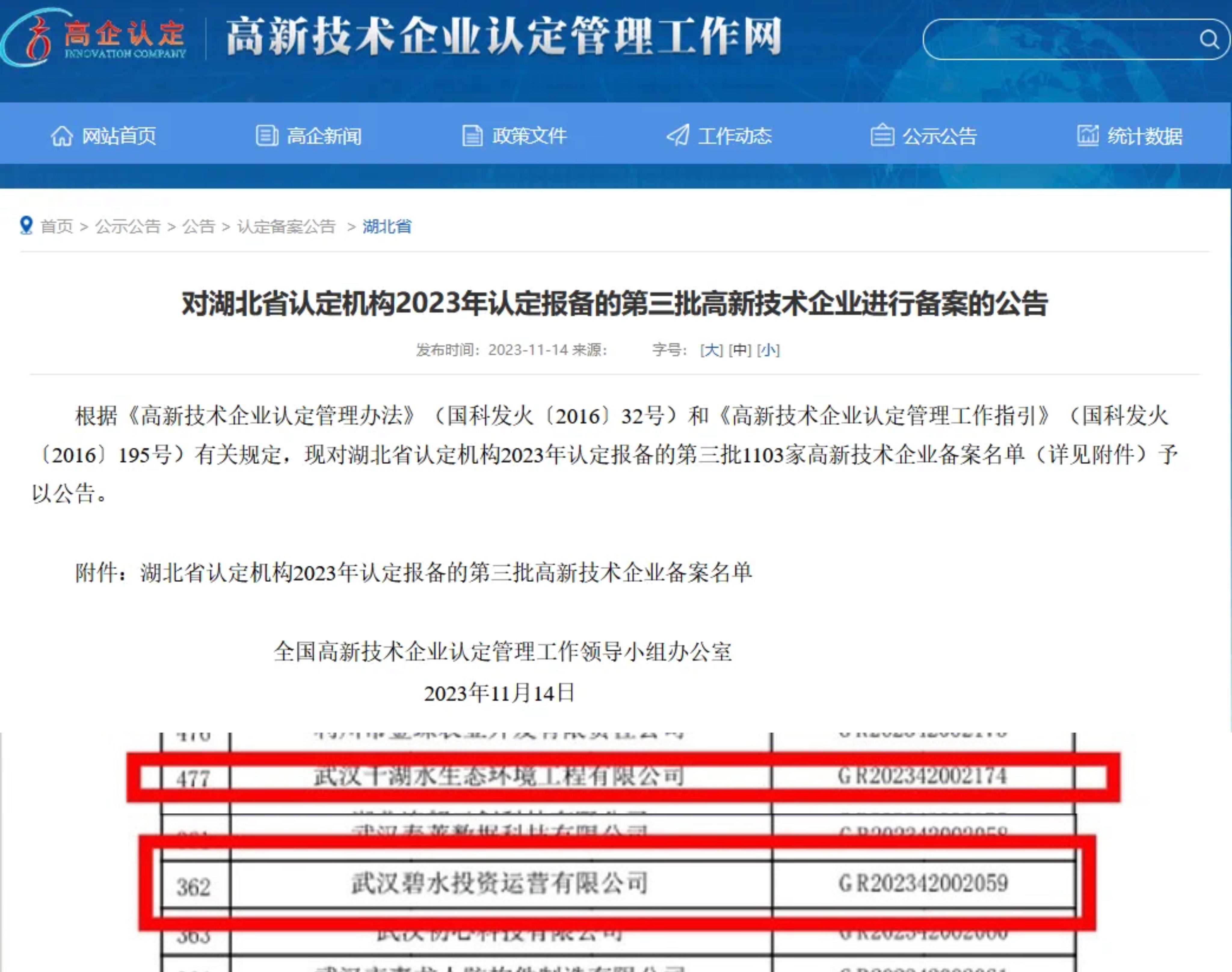 ? ? ? ?11月14日,全國高新技術(shù)企業(yè)認定管理工作領(lǐng)導小組辦公室下發(fā)了“對湖北省認定機構(gòu)2023年認定報備的第三批高新技術(shù)企業(yè)進行備案的公告”,碧水集團所屬武漢千湖水生態(tài)環(huán)境工程有限公司、武漢碧水投資運營有限公司雙雙上榜,被認定為國家高新技術(shù)企業(yè)。